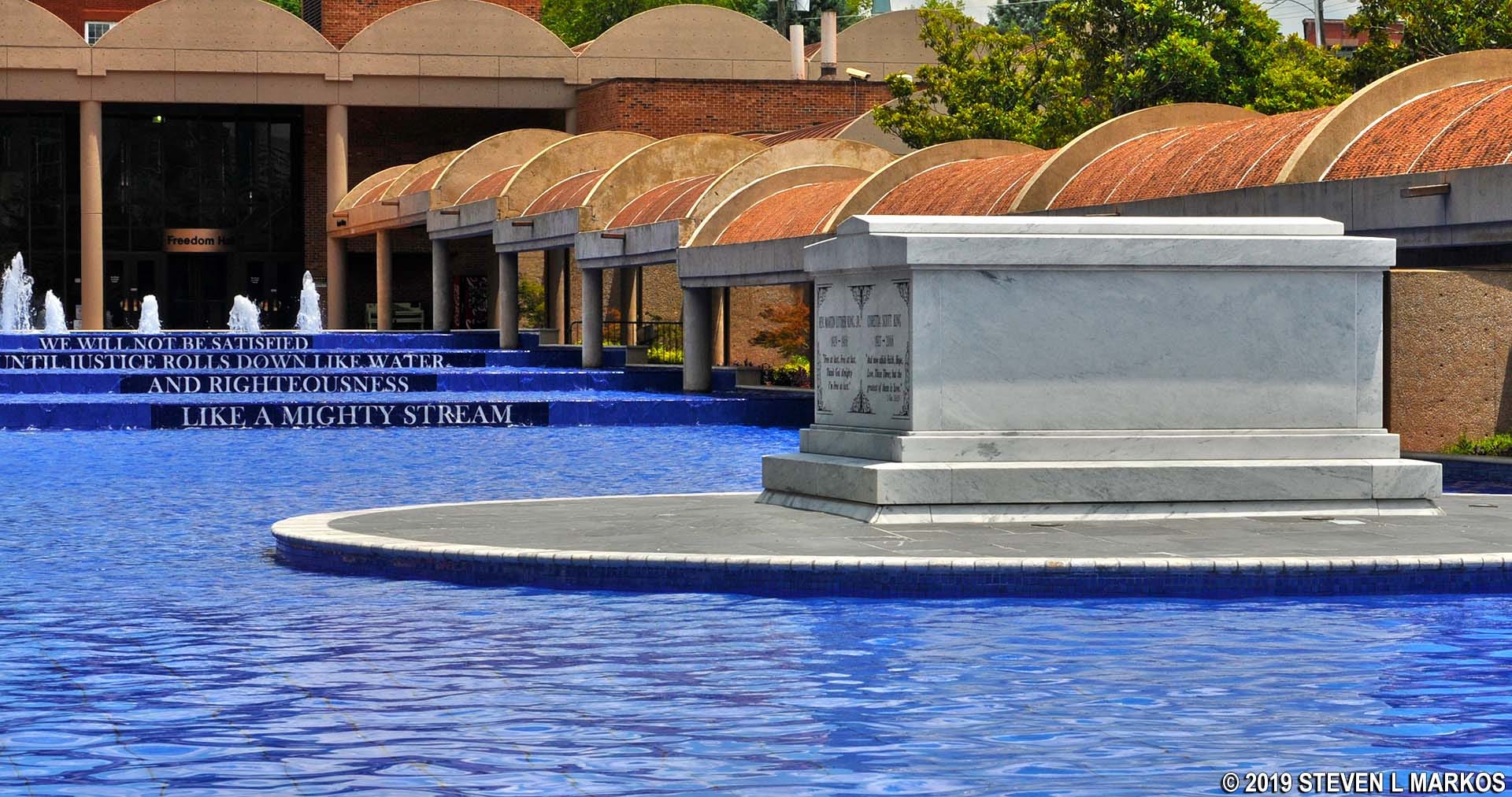 While so many of my touch points with MLK involve sampling him “into my world”, walking through the Sweet Auburn neighborhood of Atlanta finally saw me stepping into his. And today, just one more stop remained across the street. There, the sound of rushing water beckons to a memorial I’d never quite placed geographically: the tombstone for Dr. and Mrs. King, surrounded by flowing water. Placed slightly below a series of fountains, the steps of the waterfall are stamped with the quotation: